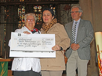 Mit einer Spende in Höhe von 1000 Euro hat unsere Stiftung Westthüringen jetzt den in Mühlhausen ansässigen Verein "Miteinander e.V." unterstützt. Den symbolischen Scheck übergab unser Kuratoriumsmitglied der Stiftung und Vorstand der VR Bank Westthüringen eG, Thomas Diwo, an die Miteinander-Aktivisten Christina Vater und NuneKagramanjan. Aktueller Anlass für die Unterstützung war unserer Stiftung die gerade eröffnete Interkulturelle Woche in Mühlhausen. Integriert in diese traditionelle Woche ist seit Jahren eine Ausstellungseröffnung in der Kirche DiviBlasii. Die Ausstellung mit dem Titel "Unsere Welt ist bunt", die Arbeiten von ausländischen und deutschen Kindern und Jugendlichen aus dem Landkreis zeigt, war Kulisse für die Scheckübergabe. "Mit unserer Unterstützung des Vereins 'Miteinander' wollen wir ebenfalls ein Zeichen setzen für Toleranz, bunte Vielfalt und gegen Rechtsextremismus. Wir wollen Gesicht zeigen", sagte Thomas Diwo. |