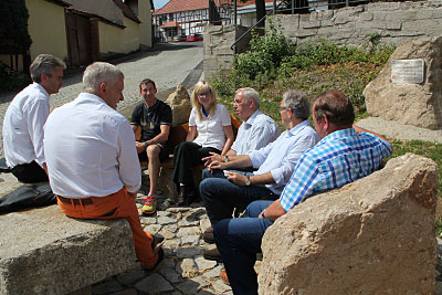 Am Mittwoch, 15. Juli 2015, traf sich das Kuratorium der Stiftung zur "Tatort-Begehung" im Hainichdorf. "Wir freuen uns sehr über die Förderung, die gleichzeitig Anerkennung unserer ehrenamtlichen Arbeit ist", begrüßte Harry Urbach, der Vorsitzende des Eigenrieder Vereins, das Gremium. Die Sitzgruppe werde von den Eigenriedern von Anfang an sehr gern genutzt. Urbach nutzte den Besuch auch, um das ehrenamtliche Engagement des Mittelpunktvereins vor: Die Rettung des Dorfgemeinschaftshaus am Anger und die Sanierung des historischen Schäferbrunnens am Hainichlandweg zählten zu den größten Projekten. "Es gibt immer viel zu tun", so Harry Urbach. Mit der gemeinsamen Kraft der Eigenrieder, der gegenseitigen Unterstützung und der Hilfe wie der von der Stiftung Westthüringen sei schon viel geschafft worden "Es ist großartig, was der Verein hier in Gemeinschaft geleistet hat. Das ganze Dorf hat etwas Bleibendes bekommen, das zudem sehr sehenswert ist", zeigte sich Ralf Schomburg, der Vorsitzende unserer Stiftung, beeindruckt.